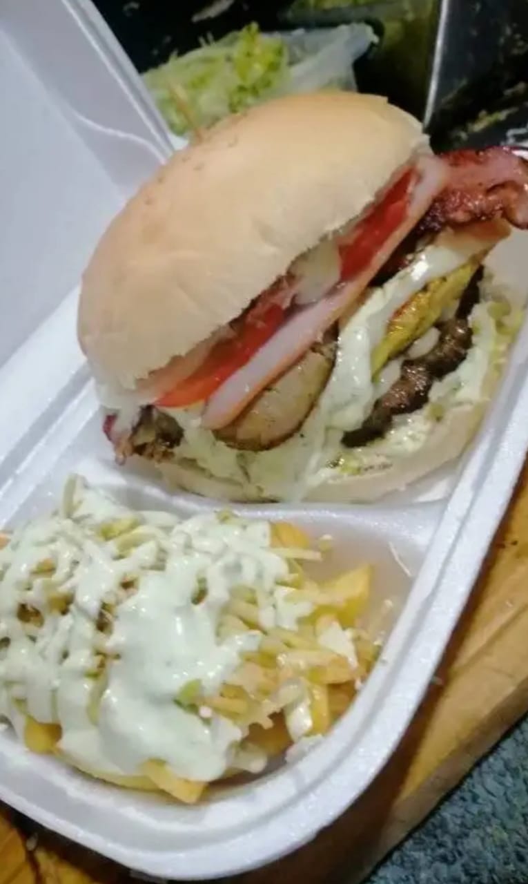 Pan francés, 80 g de carne, jamón, queso, lechuga, salsa de tomate y mayonesa.
