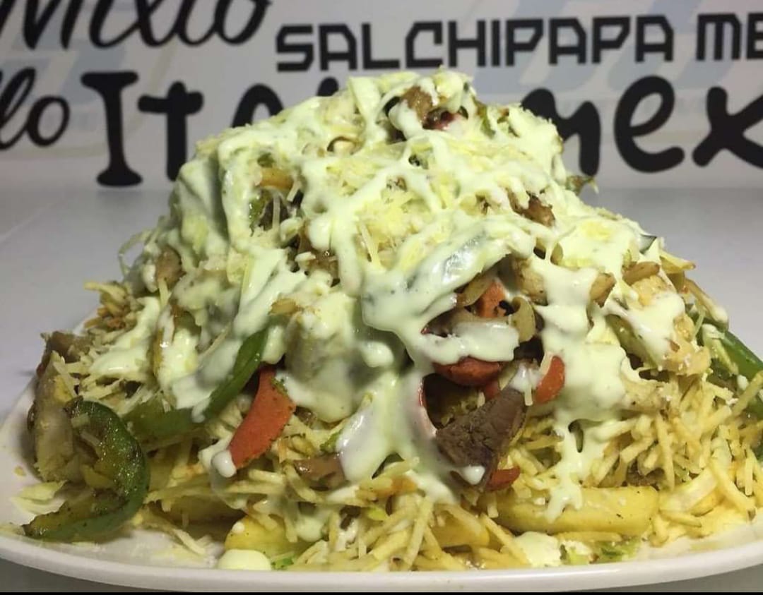 Papas a la francesa, salchicha Suiza, salchicha manguera, queso gratinado, papas chongo, lechuga, salsa de la casa.