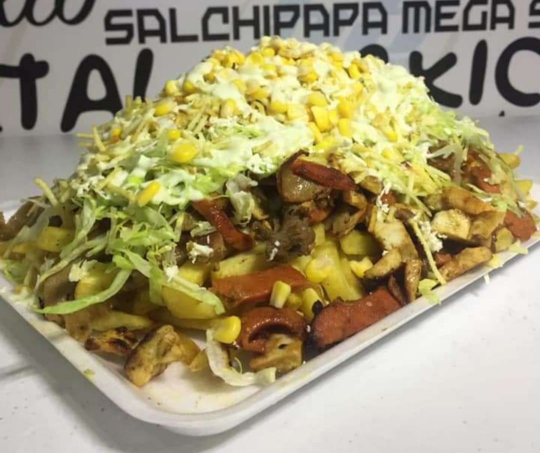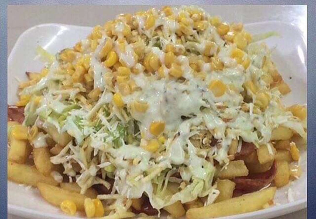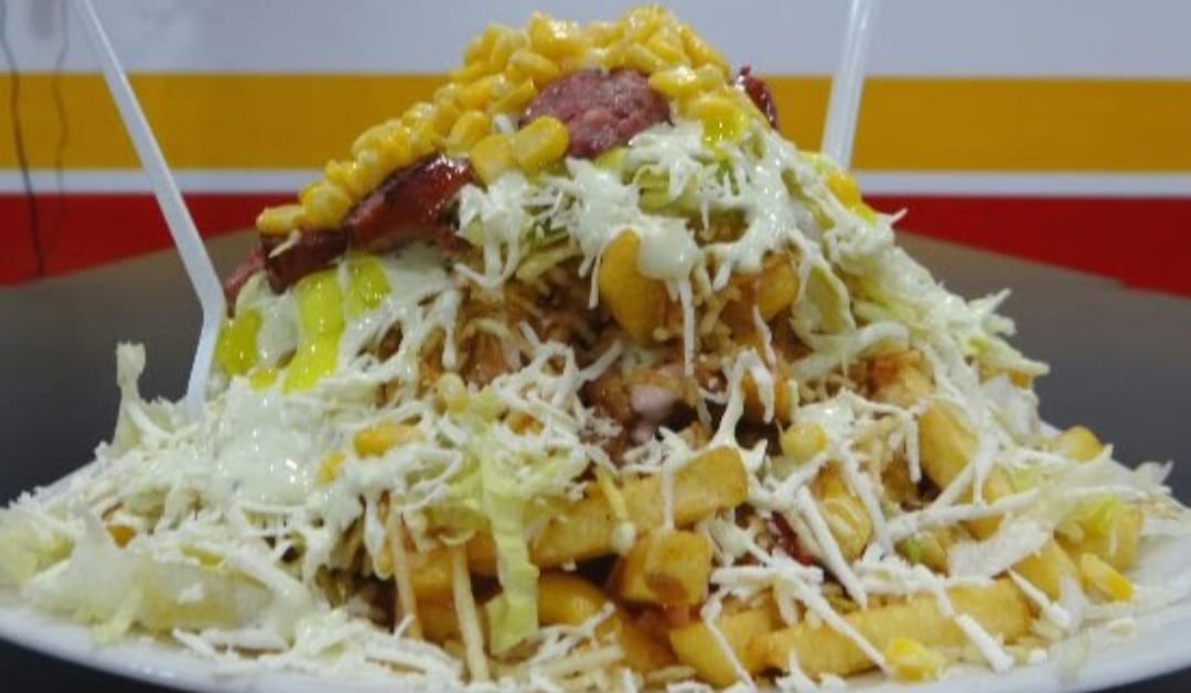 Papas a la francesa, salchicha, papas ripio, piña en trocitos, tocineta, lechuga, jamón, salsa de tomate y mayonesa.