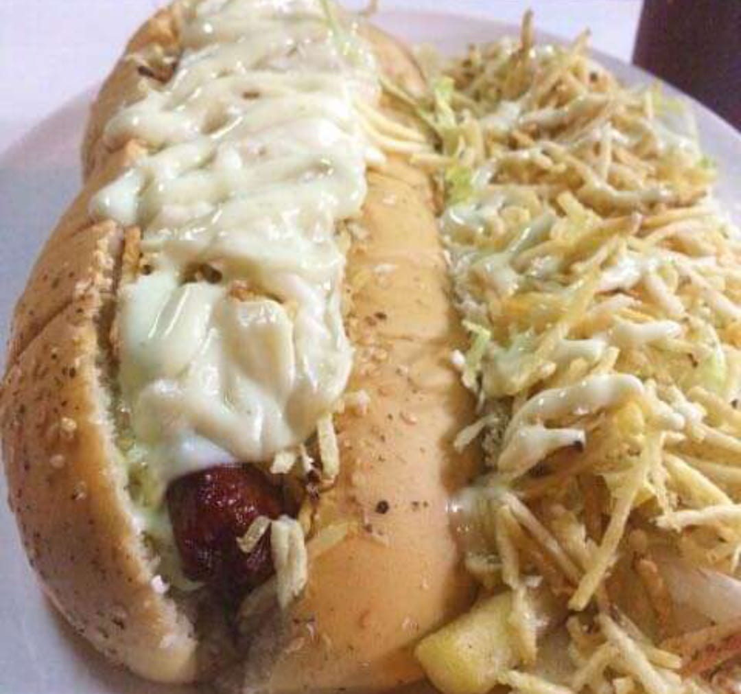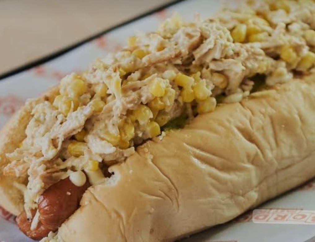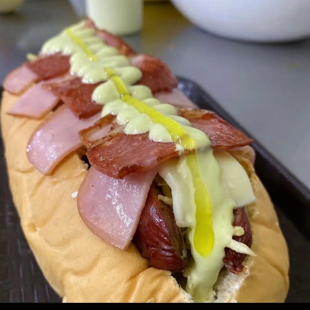 Pan, salchicha Ranchera, piña, tocineta, papas ripio, salsa de guacamole y mayonesa.