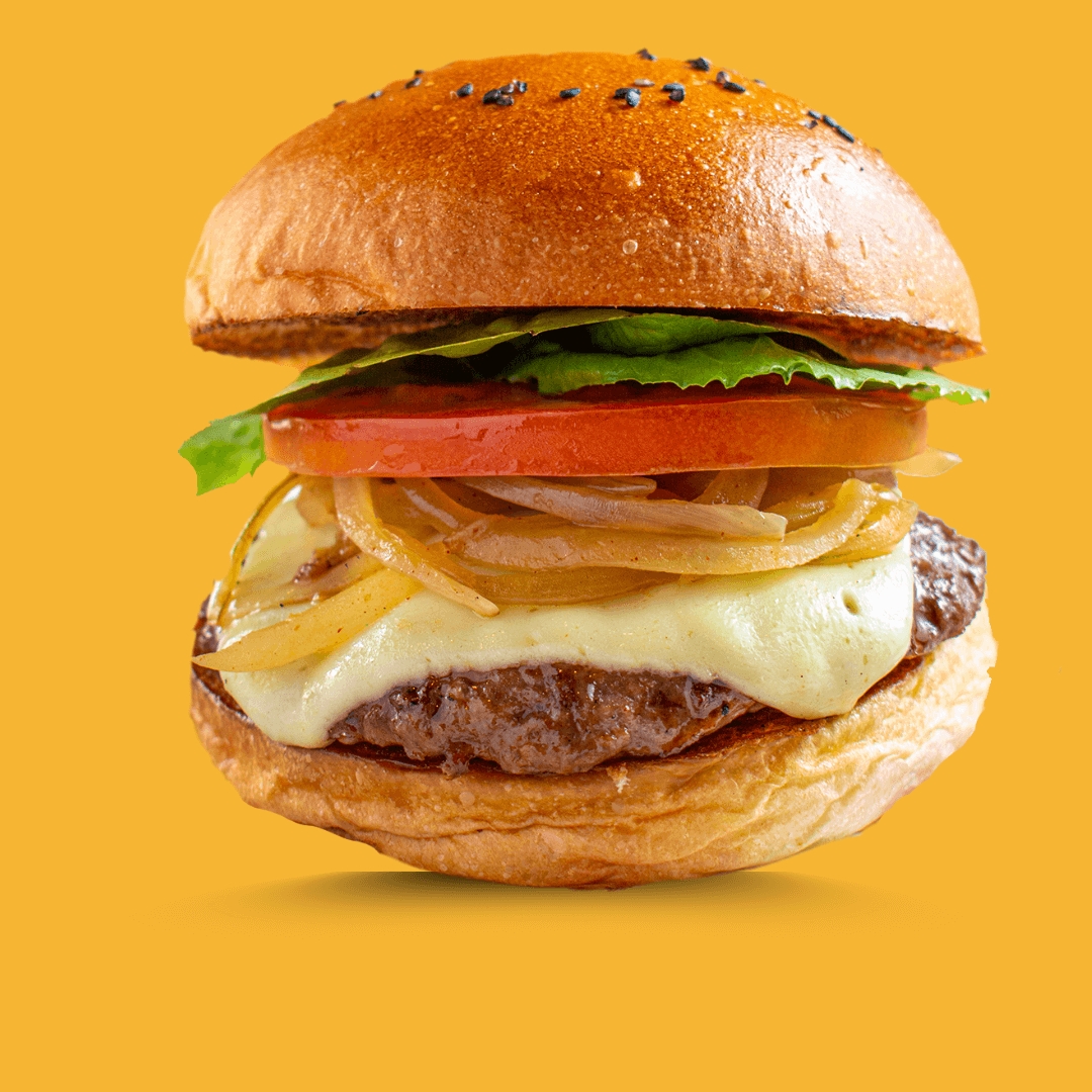 125 g De pechuga de pollo y 125 gr de carne de la casa, queso cheddar, lechuga, tomate, cebolla caramelizada, jamón.
