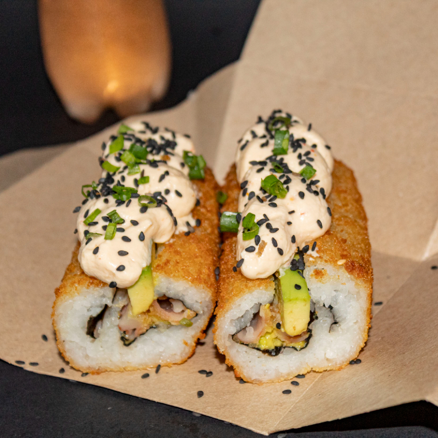 Arroz de sushi empanizado en forma de pan de perro caliente relleno con los elementos de alguno de los rollos