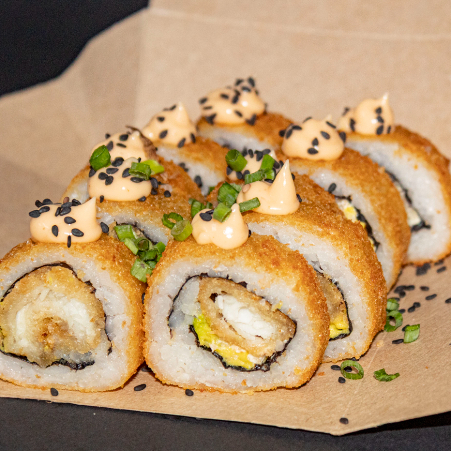 12 Bocados de sushi apanado relleno de pescado blanco, queso crema