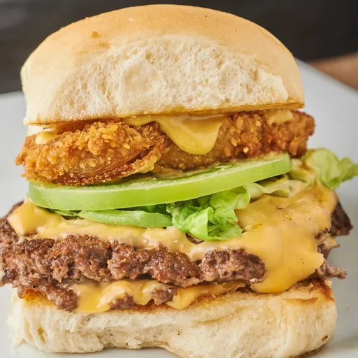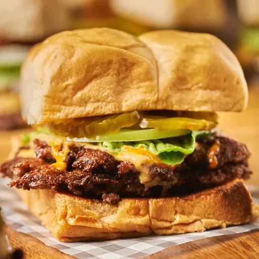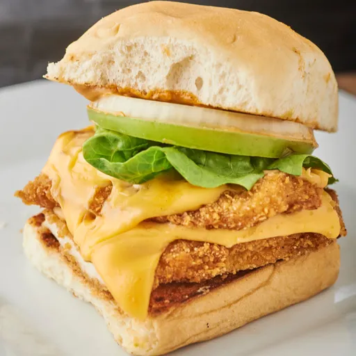 Burger de 120 g de pechuga apanada, doble queso americano, lechuga, tomate verde, cebolla y salsa a elección.