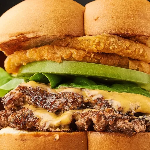 Combo de 180 g de hamburguesa certified angus beef, doble queso americano, lechuga, tomate verde, aros de cebolla apanados y salsa a elección.