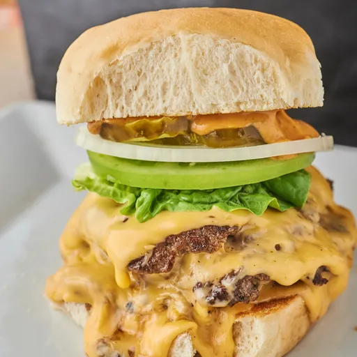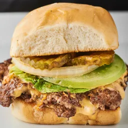 120 g De hamburguesa certified angus beef, doble queso americano, lechuga, tomate verde, cebolla, pepinillos y salsa a elección.