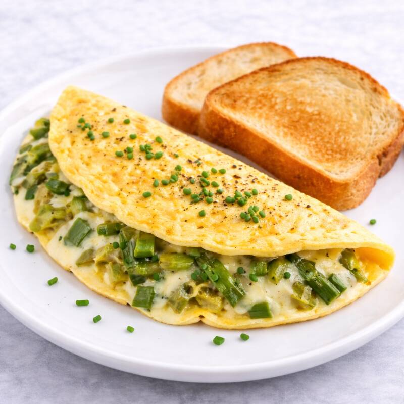 Omelette de huevo relleno de puerro, cebollín, cebollín chino y queso mozzarella, acompañado de pan tostado.
