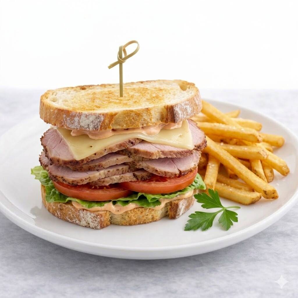 Pan artesanal con lomo ahumado, lechuga, tomate, queso y salsa de la casa, acompañado de papas a la francesa.