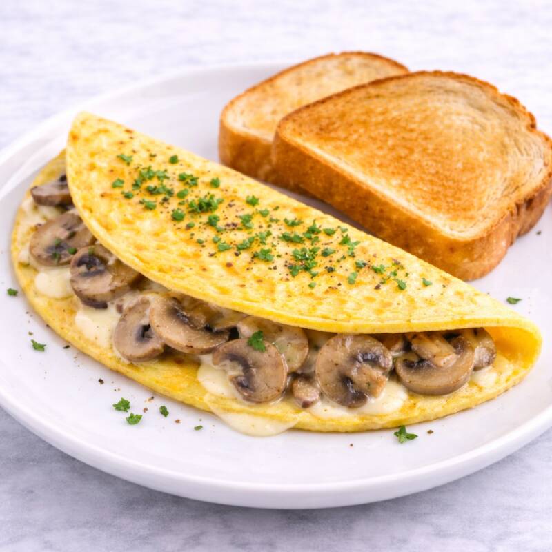 Omelette relleno de champiñones salteados y queso mozzarella, acompañado de pan tostado.
