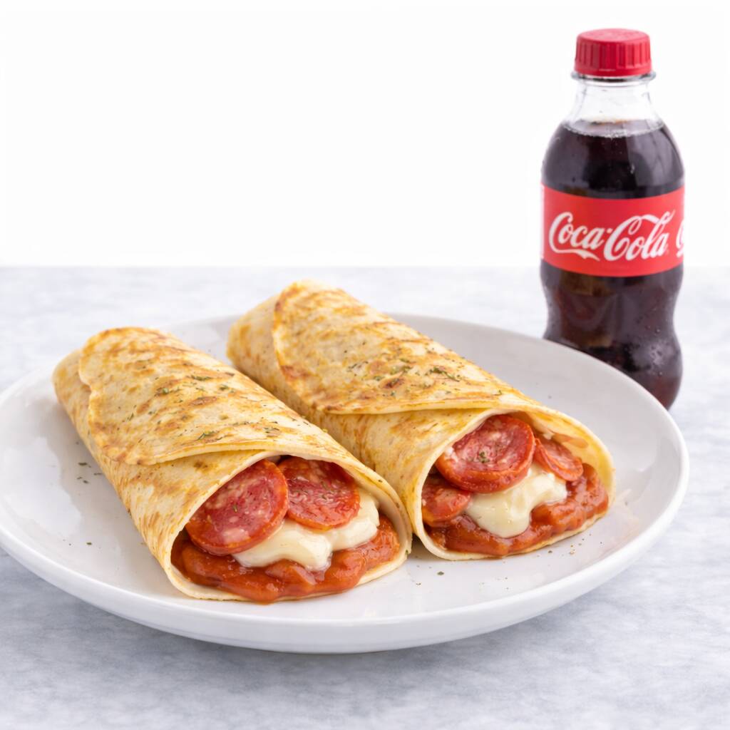 Dos crepes rellenos de salsa napolitana, queso mozarella y salami, acompañados de mini gaseosa