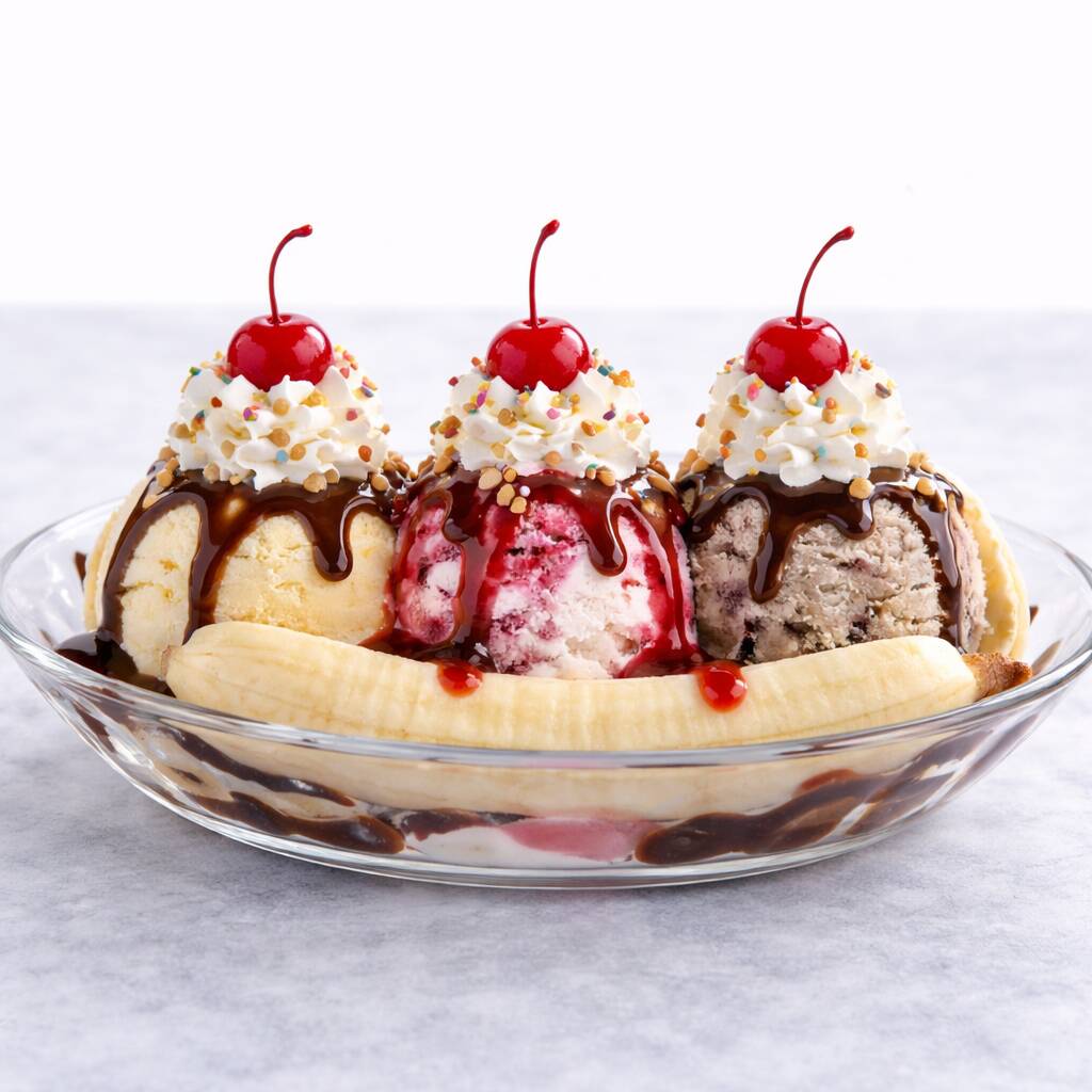 Banana split con tres bolas de helado: vainilla, vainilla con vetas de mora y Oreo, coronadas con crema batida y salsa de chocolate y fresa.