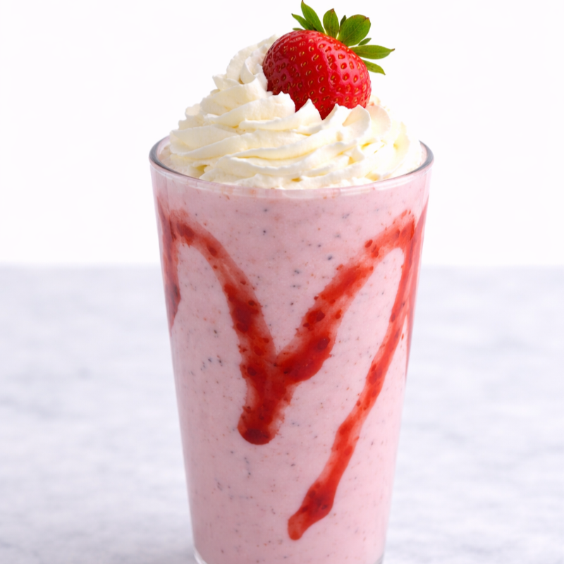Malteada de helado de frutos rojos, con salsa de fresa en el vaso, coronada con crema batida y decorada con una fresa.