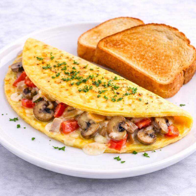 Omelette relleno de pimentón, cebolla, champiñones y mozzarella, acompañado de pan tostado.