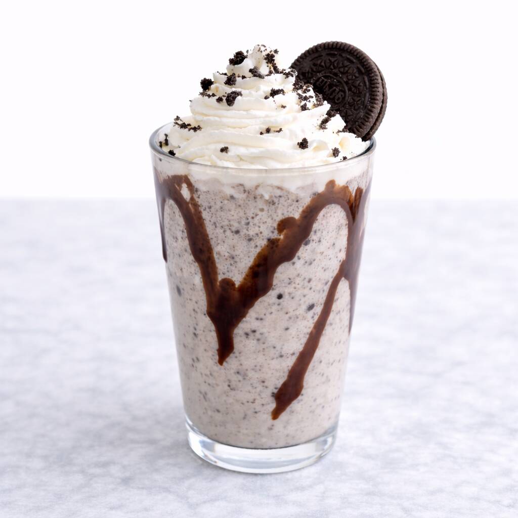 Malteada de helado de Oreo, servida con acabado de chocolate en el vaso y finalizada con crema batida.