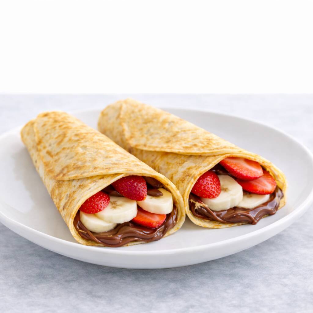Dos crepes con crema de avellana (Nutella), banano y fresas.