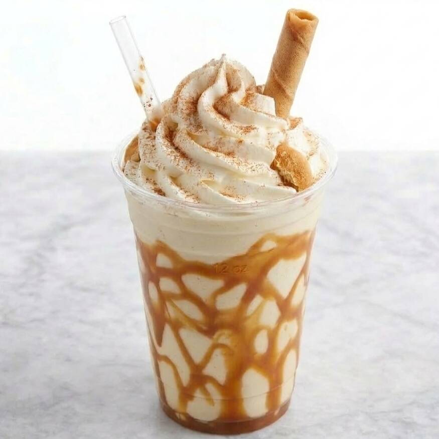 Malteada de helado de vainilla con salsa de caramelo, acompañada de barquillo.