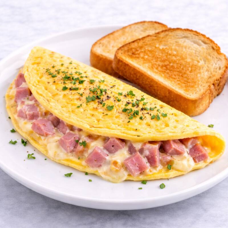 Omelette relleno de jamón de cerdo y queso mozzarella, acompañado de pan tostado.