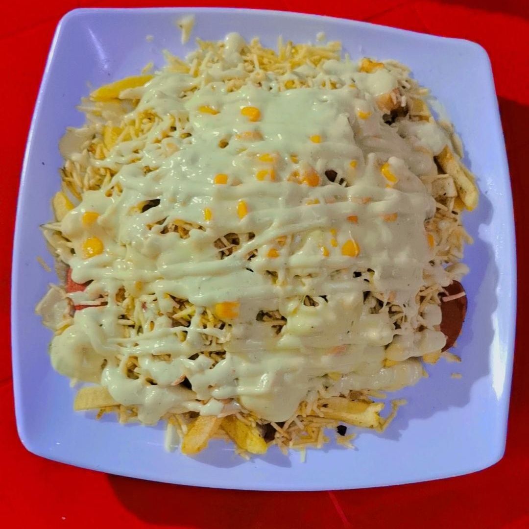 Salchicha, papas a la francesa, queso costeño, chongo y salsa de la casa.