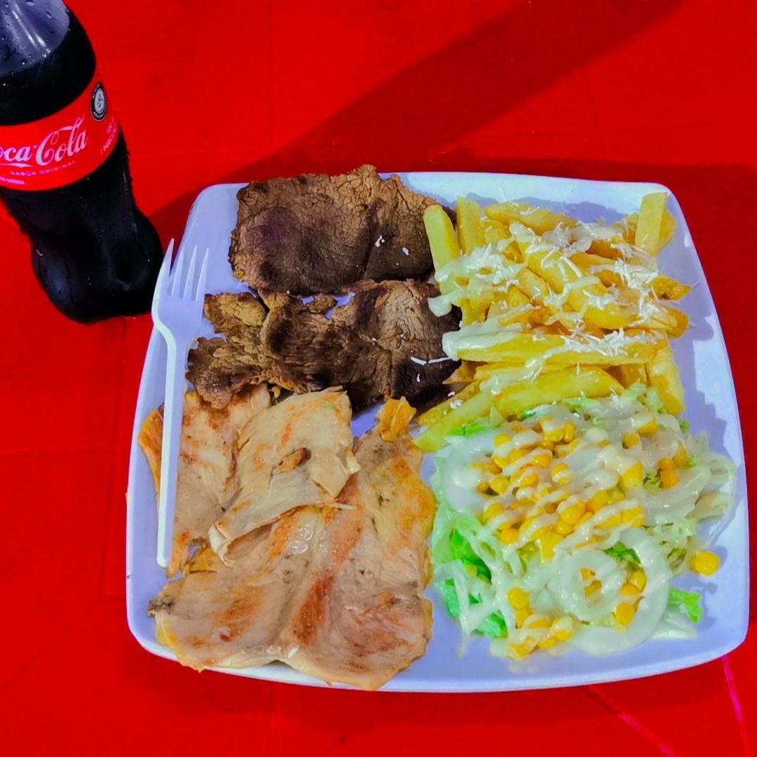 Pollo, chorizo, butifarra, cerdo, res, salchicha, queso costeño, chongo y salsa de la casa.