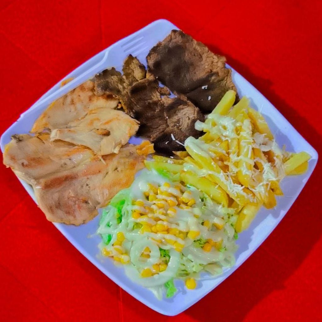 Trae: Pechuga, Carne, papas fritas, ensalada