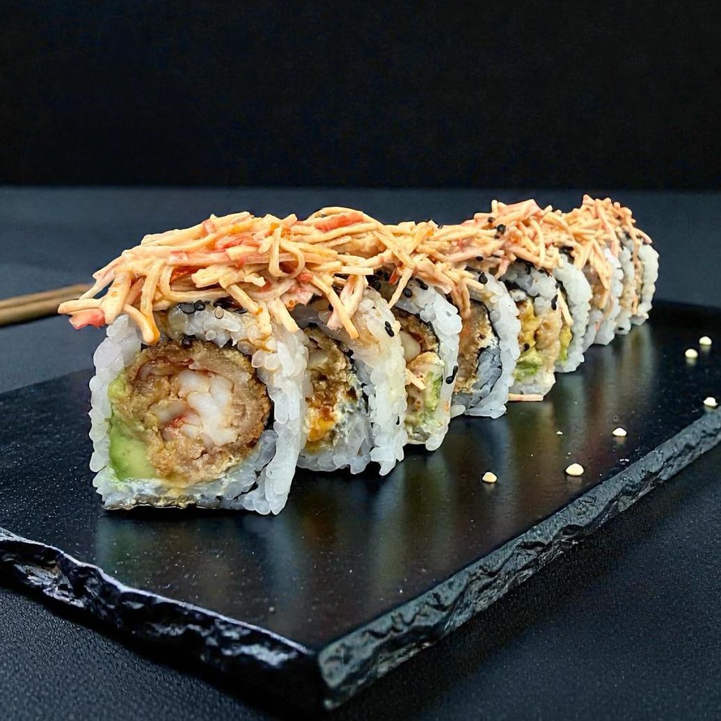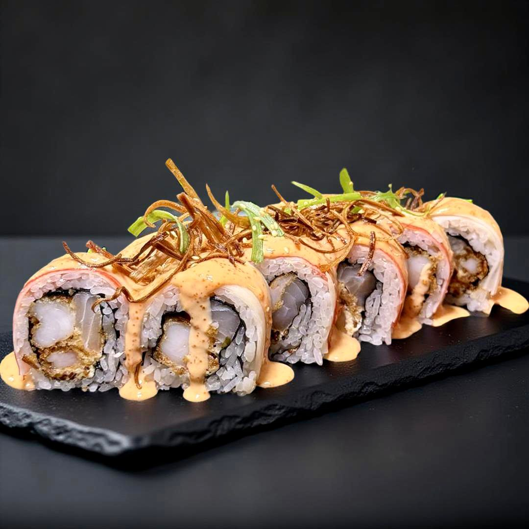 Rollo envuelto en arroz de sushi y alga nori, con camarón furai (frito), pescado fresco, queso crema y puerros caramelizados, coronado con kanikama en salsa diabla, que le da un toque picante y lleno de carácter.
