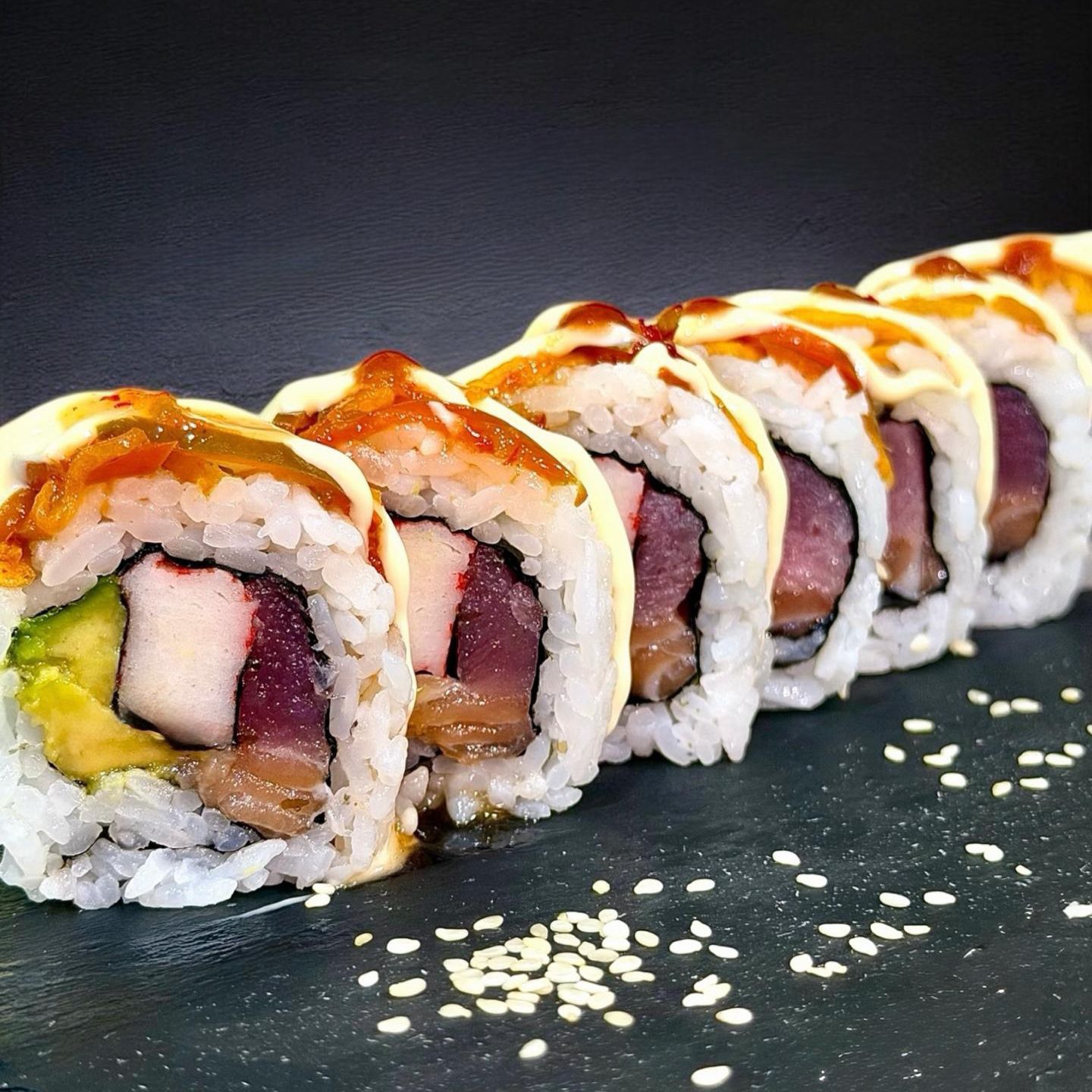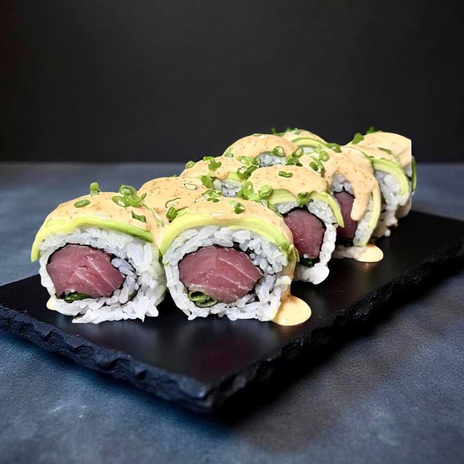 Rollo tradicional envuelto en arroz de sushi y alga nori, relleno de atún fresco y cebollín, finalizado con un topping de aguacate y bañado en una spicy mayo umami.