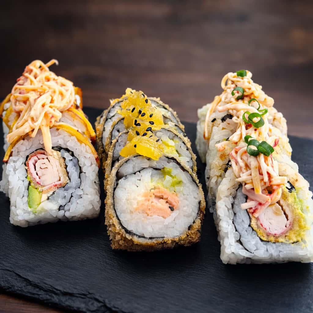 Palmito furai con aguacate y queso crema, plátano maduro y kanikani picante. Salmón con queso crema y aguacate tempura, salsa dulce de piña y ajonjolí. Palmito furai con aguacate y queso crema, cabello de ángel y cebollín chino.