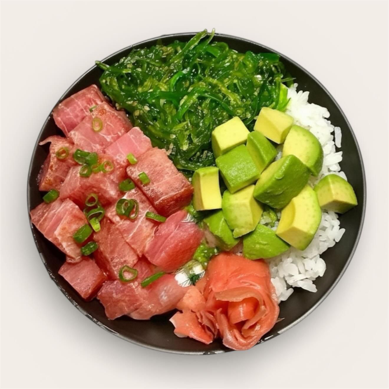 Bowl con base de arroz de sushi, ensalada de alga, aguacate, jengibre y atún fresco. Finalizado con cebollín y ajonjolí, y acompañado de nuestra salsa soja todaiji, que aporta un sabor profundo y equilibrado.