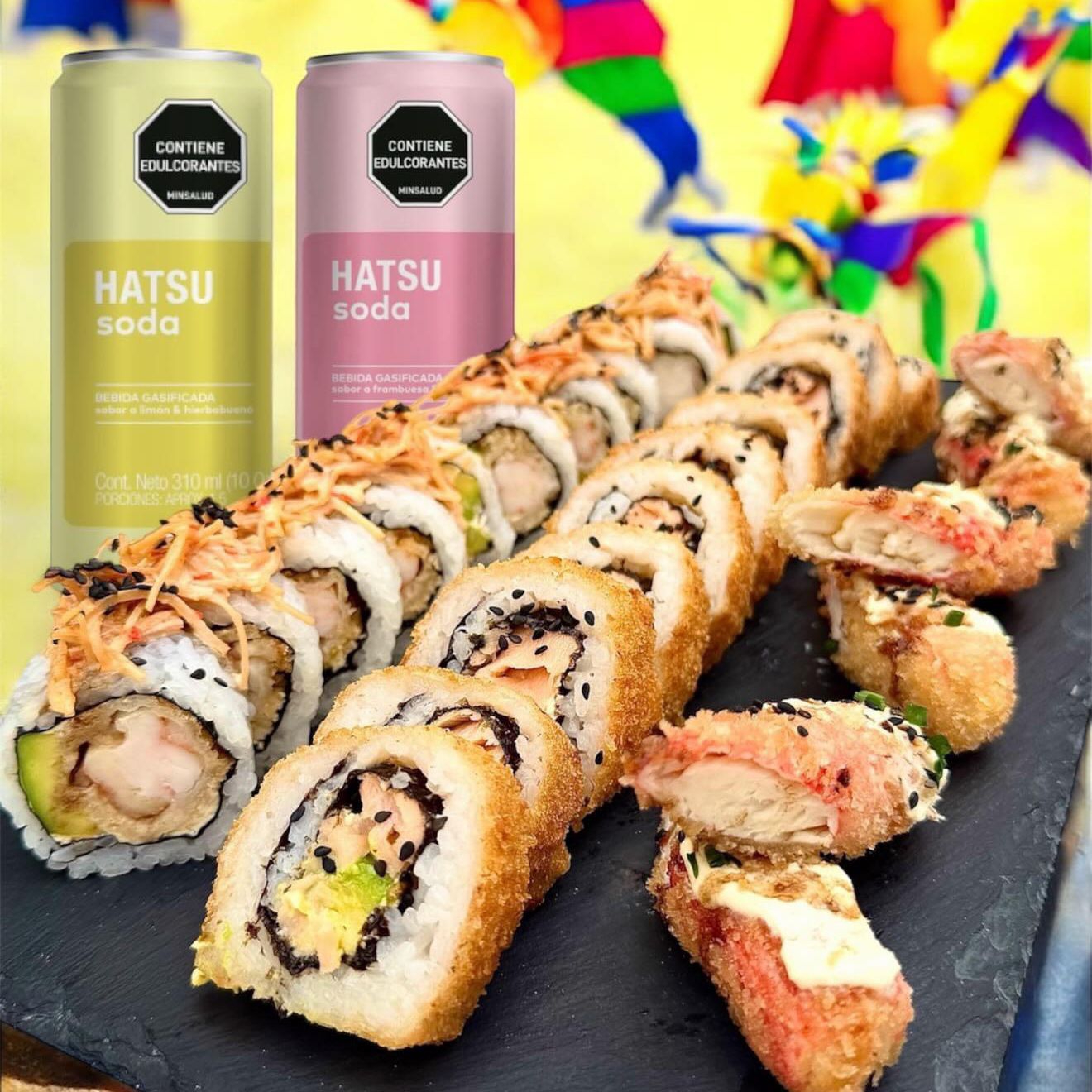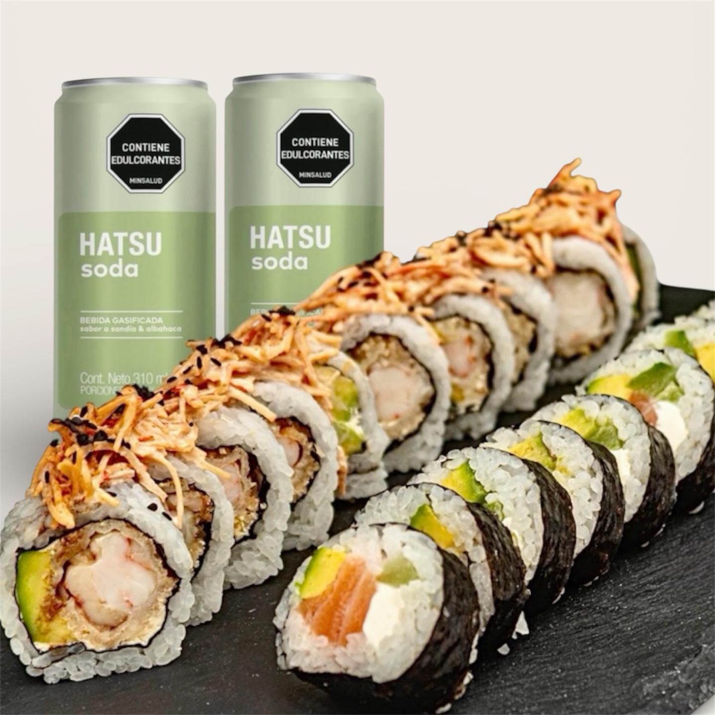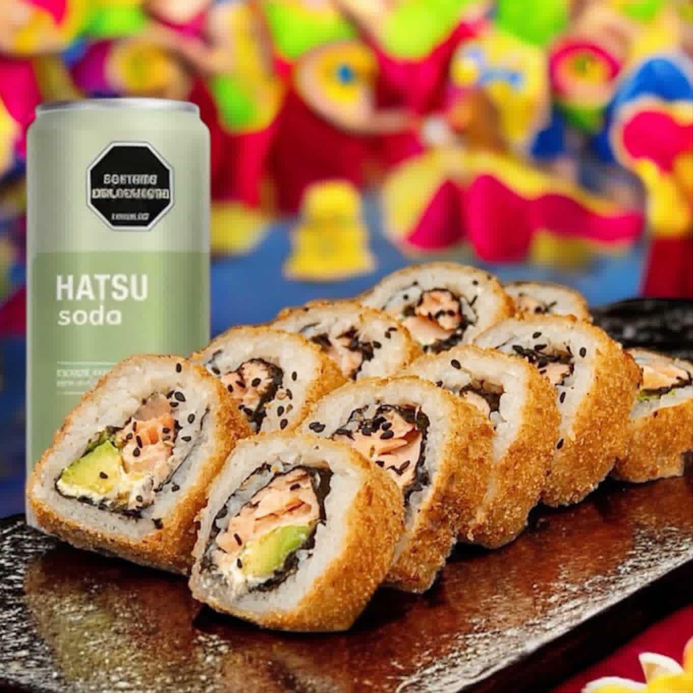Delicioso Rollo de Sushi Tempurizado con salmón, aguacate y queso crema + Hatsu soda