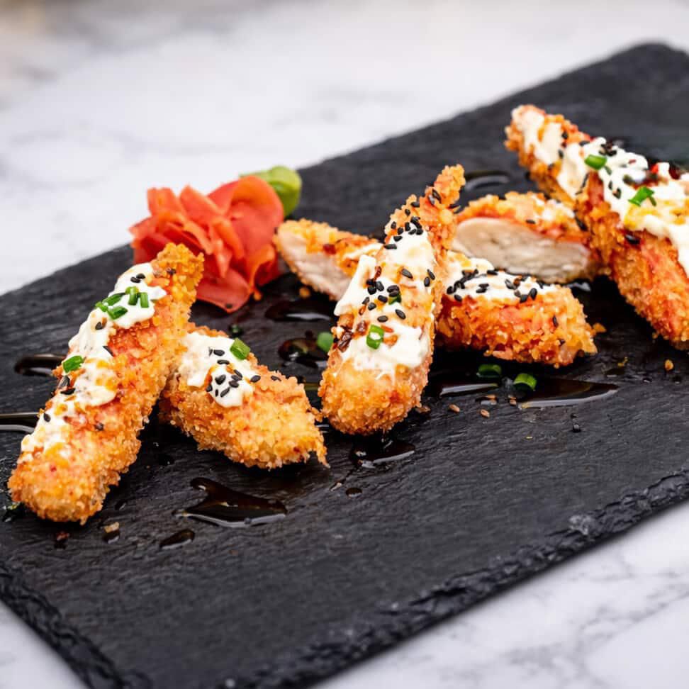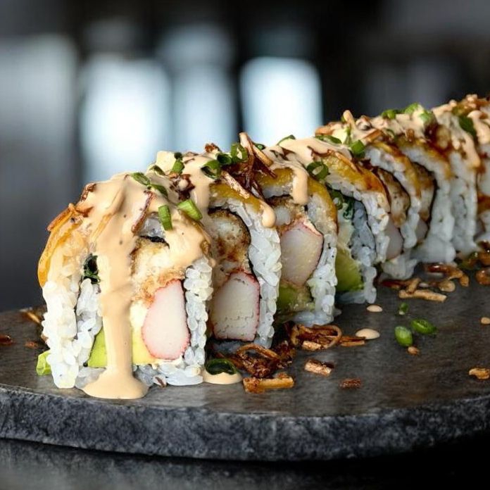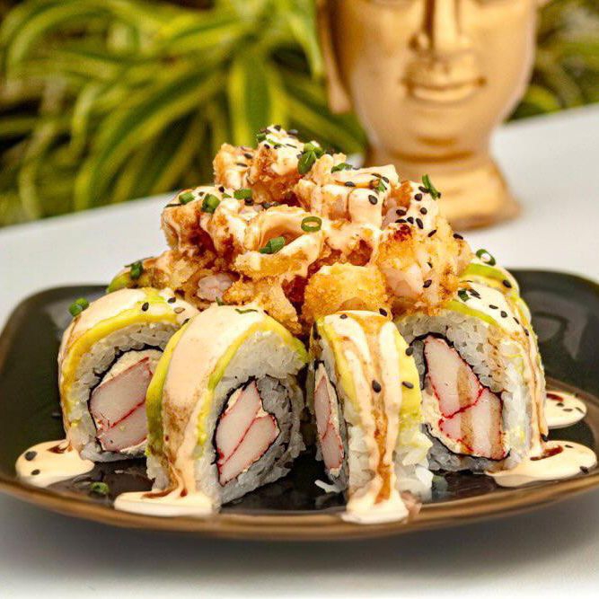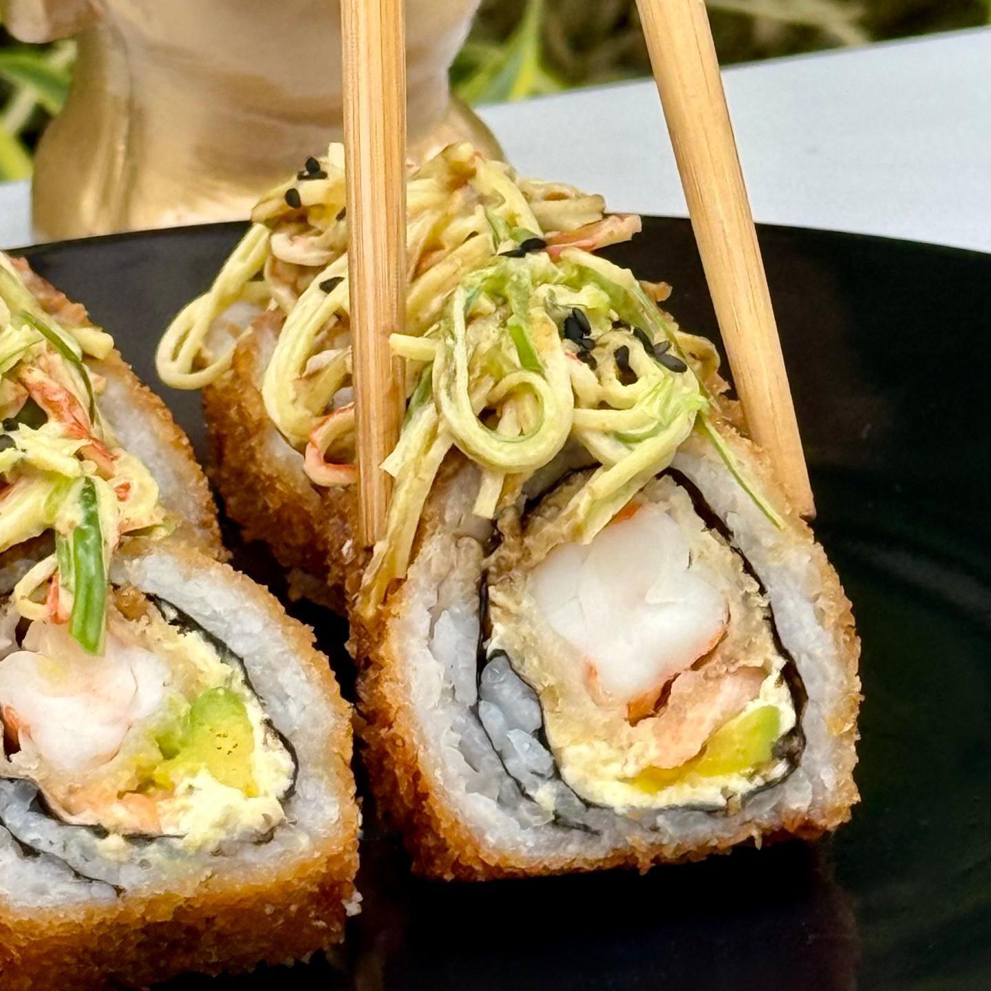 Langostino crocante, queso crema y aguacate, envuelto en arroz de sushi tempurizado. Coronado con ensalada de kani y algas.