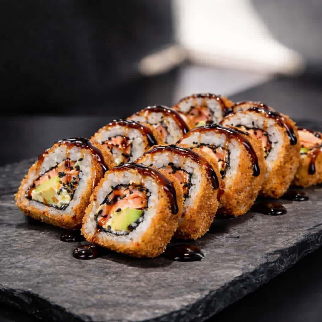 Delicioso Rollo de Sushi Tempurizado con salmón, aguacate y queso crema.