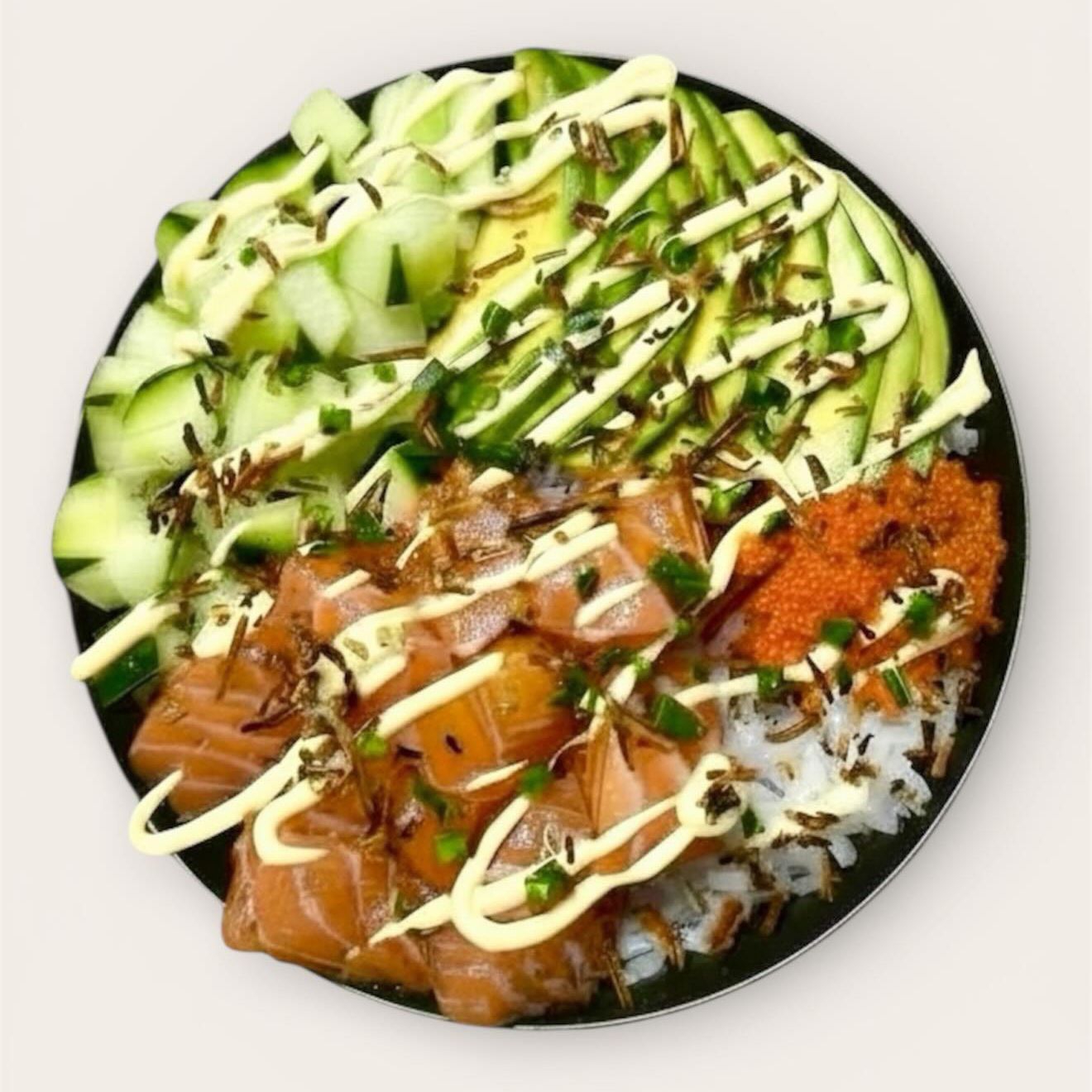 Bowl con base de arroz de sushi, pepino fresco, aguacate y puerros crispy, coronado con salmón fresco y un toque de mayonesa acevichada que realza los sabores.