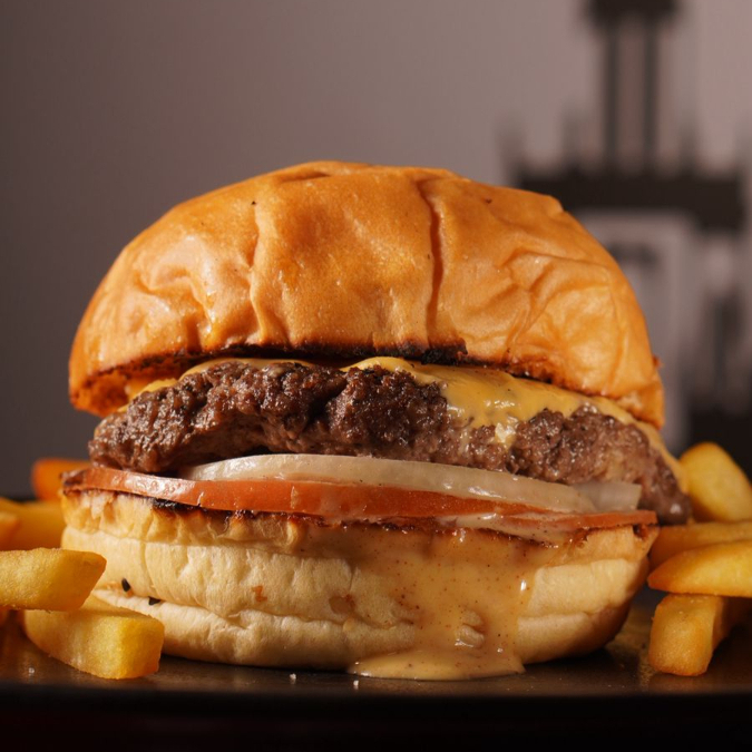 Pan artesanal, lechuga, tomate, cebolla, 150 gramos de carne angus y queso americano papas francesa.