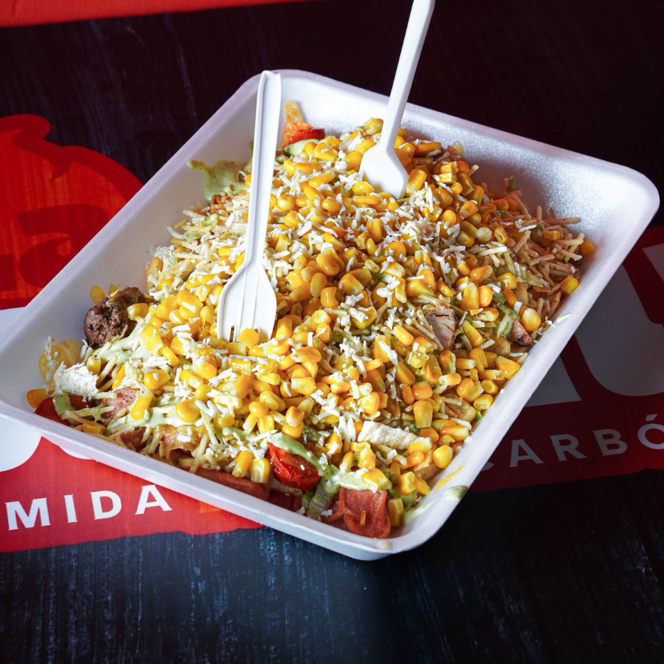 100 g De pollo, 100 g De lomo de res, queso costeño, lechuga, papita chongo, salsas de la casa.