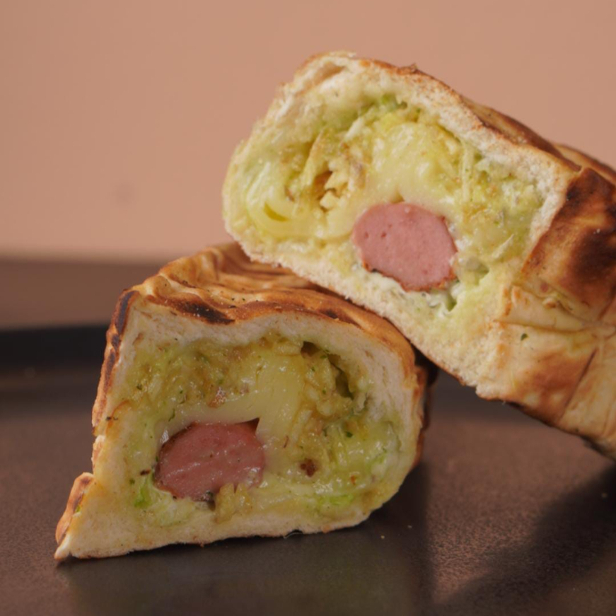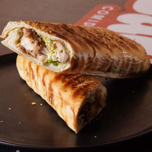Pan artesanal, pollo desmenuzado y queso mozzarella.