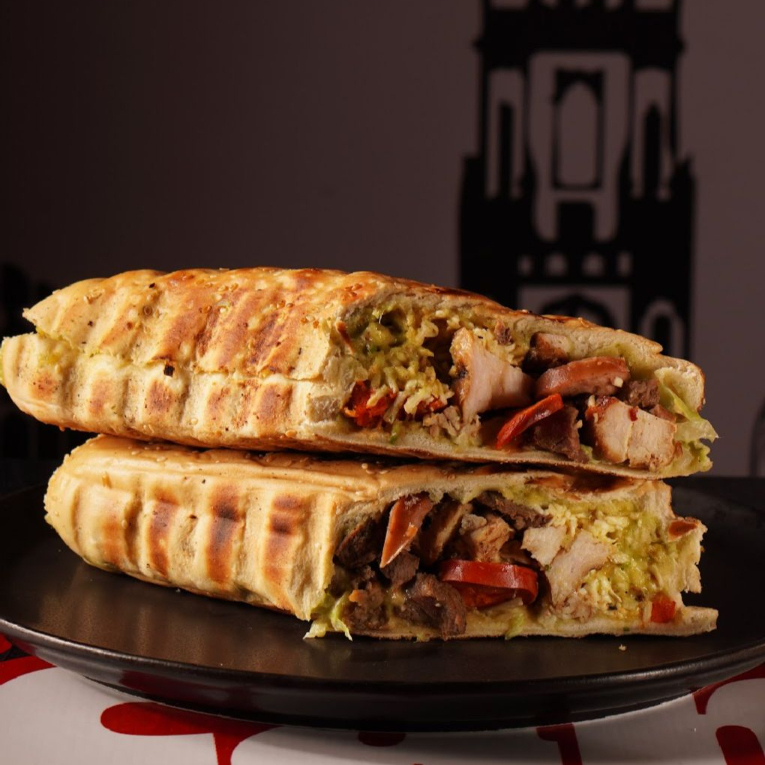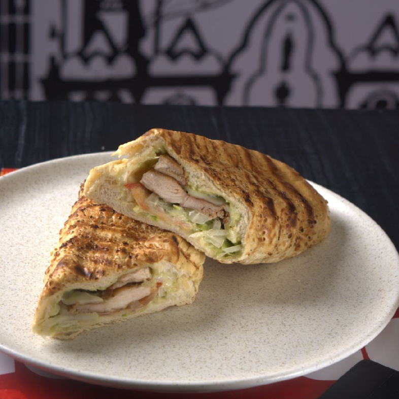 Pan artesanal, pollo, jamón, tocineta y queso mozzarella.