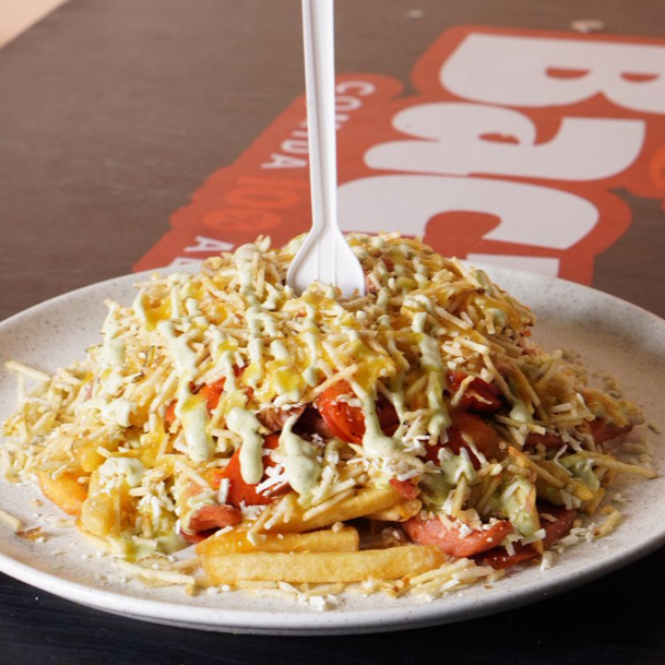150 g de papas a la francesa, salchicha americana, chorizo (1 unidad), butifarra (1 unidad), queso costeño, papita chongo, salsa tártara y salsa de piña.