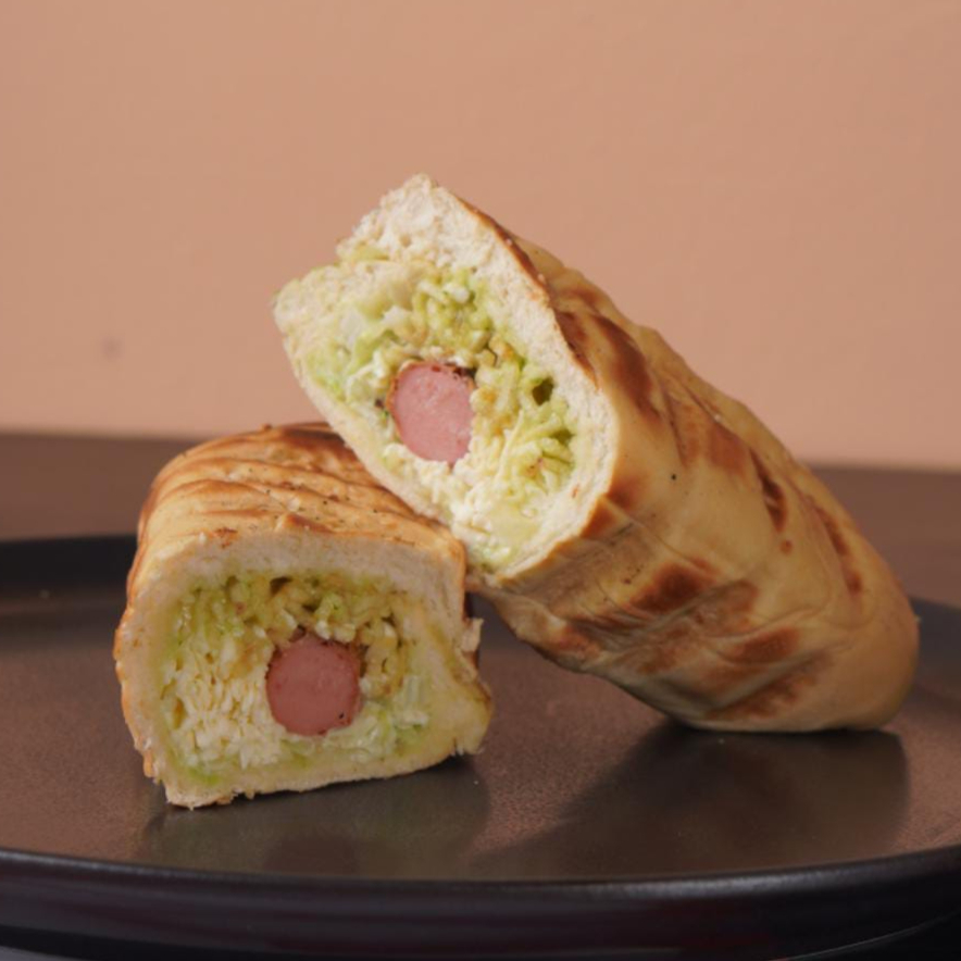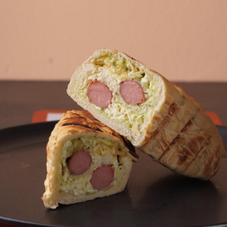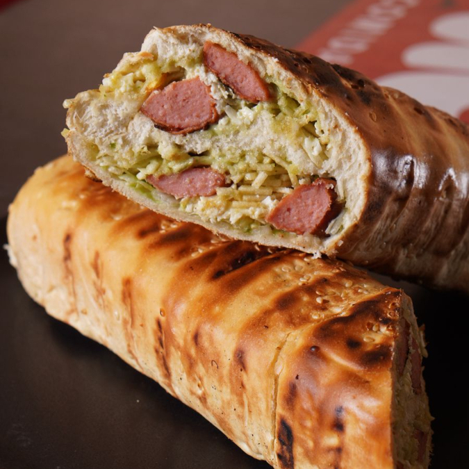 Pan artesanal, salchicha americana, lechuga, papa chongo, salsa tartara, salsa piña, queso costeño y queso mozzarella derretido.