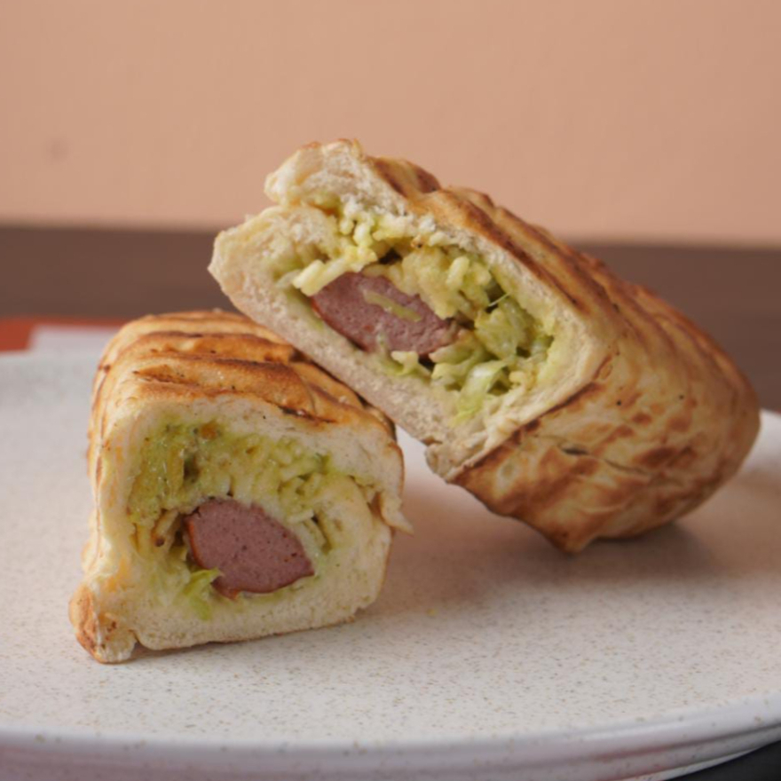 Pan artesanal, salchicha ranchera, lechuga, papa chongo, salsa tártara, salsa piña y queso costeño.