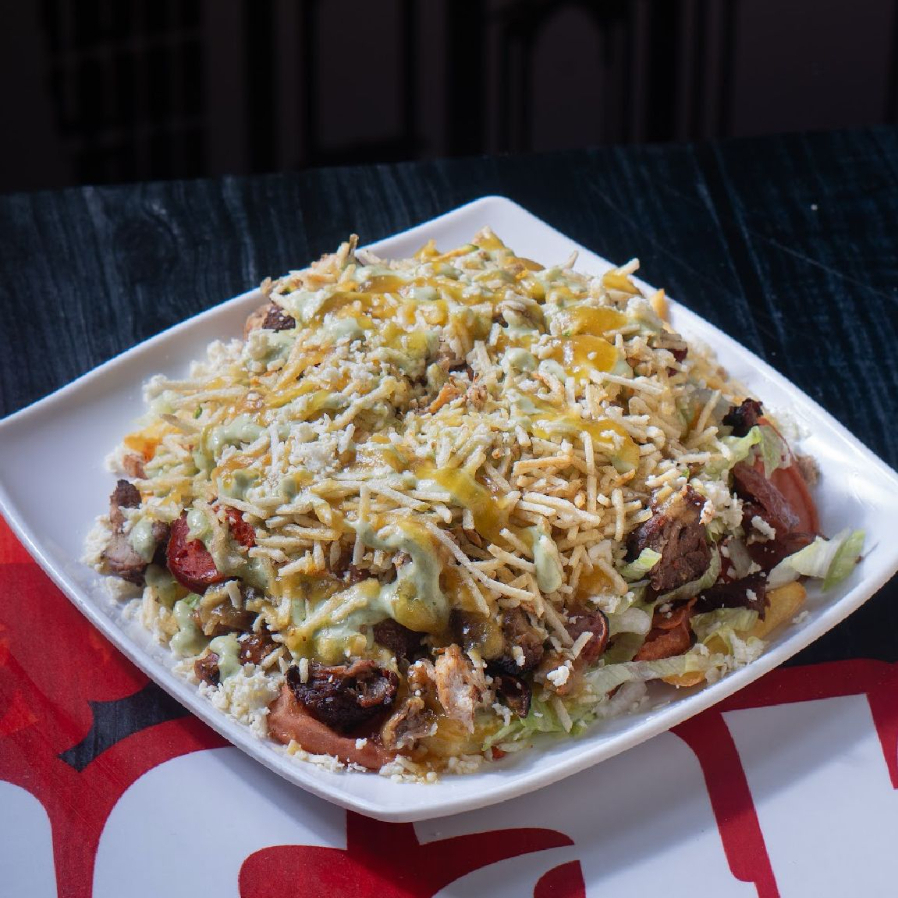 Papas a la francesa, salchicha americana, carne asada, lechuga, queso costeño, papa chongo y tártara.