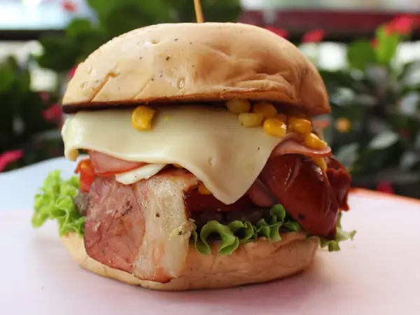 pan brioche carne de la casa cebolla tomate tocineta suiza mozarella maiz porcion de papa mas gaseosa