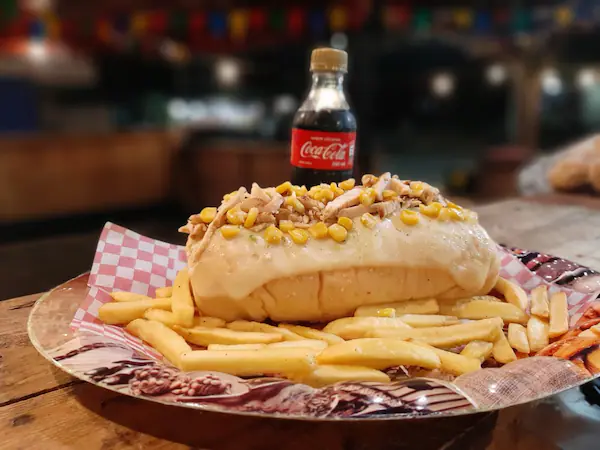 Pan perro, pollo, chorizo, butifarra, alemana, jamón, queso costeño, lechuga, chongo mas papas y gaseosa.