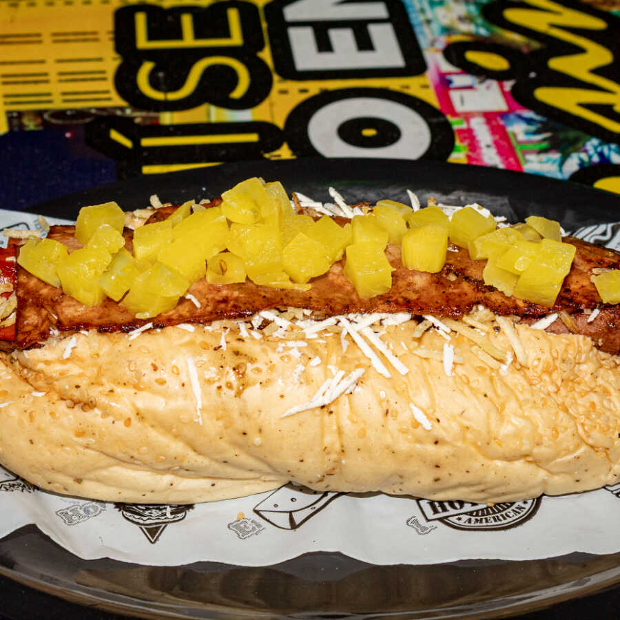 Pan perro, salchicha suiza, tocineta, queso costeño, mozzarella, lechuga, chongo y gel de piña.