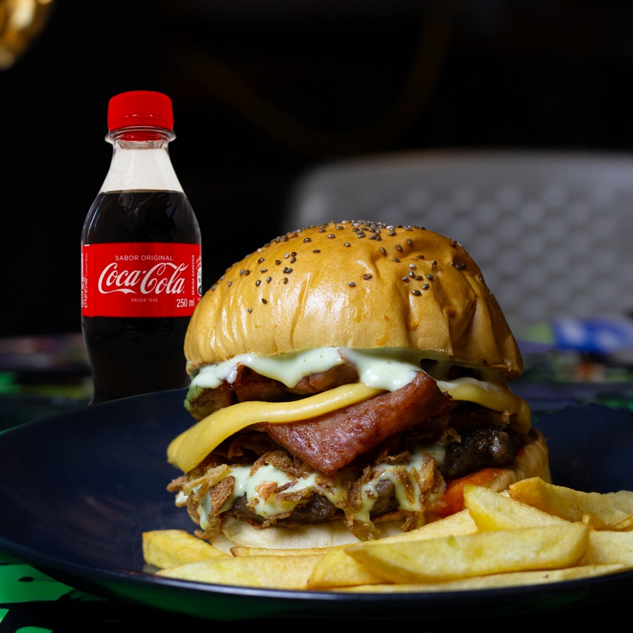 Hamburguesa con pan a base de papa, carne de la casa o pechuga de pollo, tocineta, mozzarella, lechuga, cebolla crispy, tomate, salsa de la casa mas papas y gaseosa.