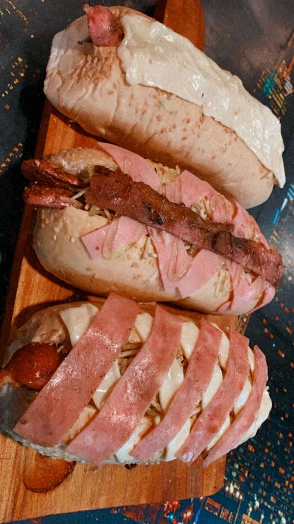 Pan perro, salchicha, jamón, tocineta, queso costeño, lechuga, chongo y salsa de piña.+papa+gaseosa