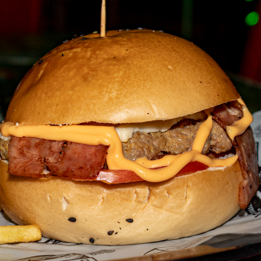 Pan finas hierbas, doble carne de la casa, tocineta, mozzarella, queso americano, crocante de queso costeño, lechuga, cebolla BBQ y tomate.