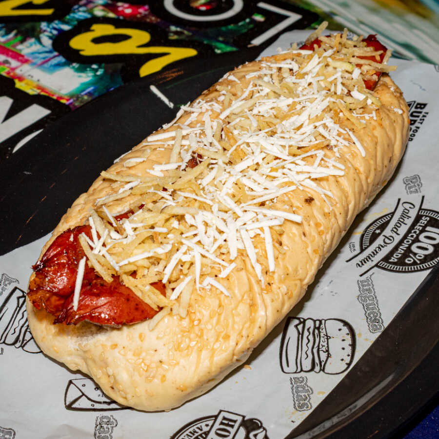 Pan perro, salchicha, queso costeño, mozzarella, lechuga y chongo.
