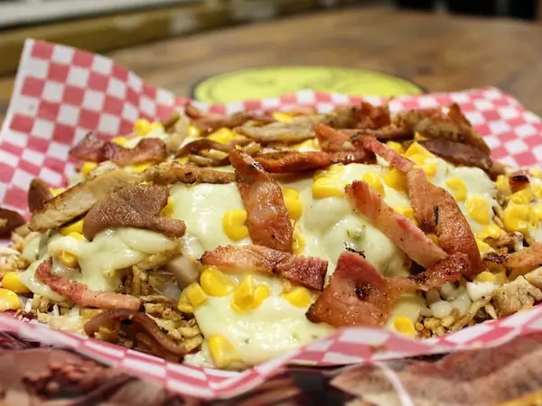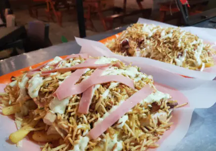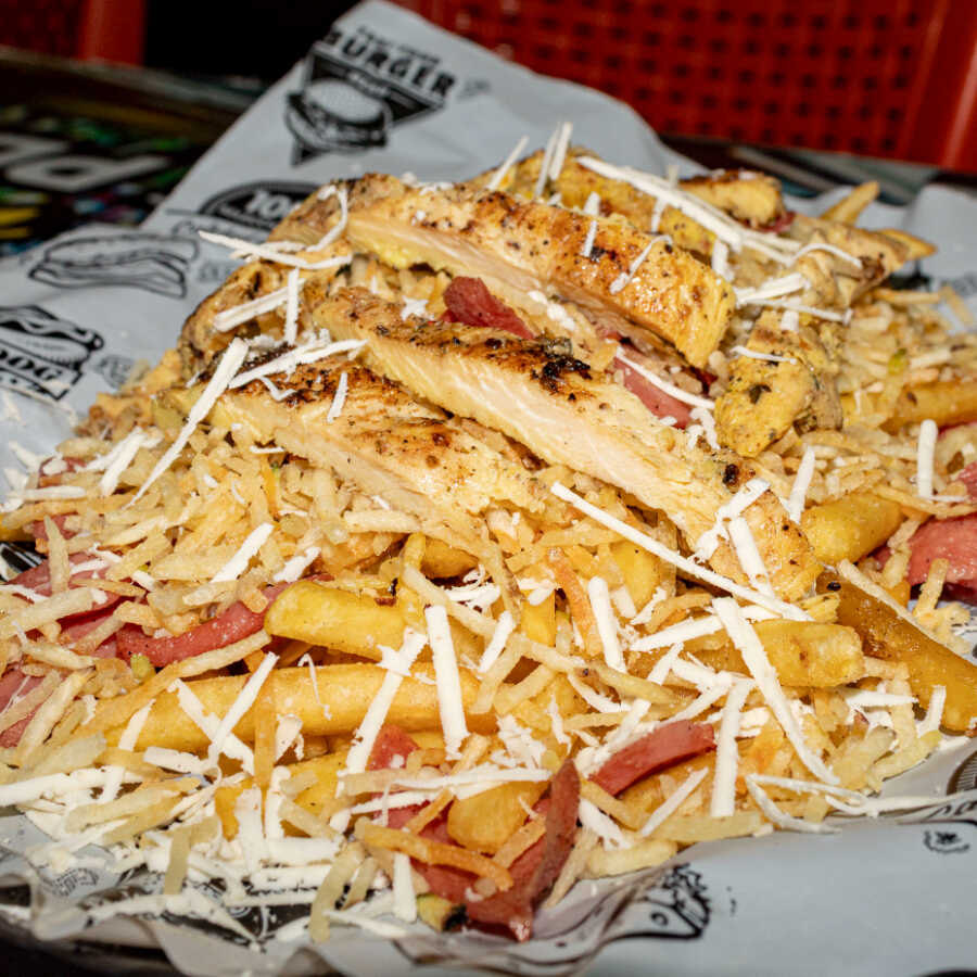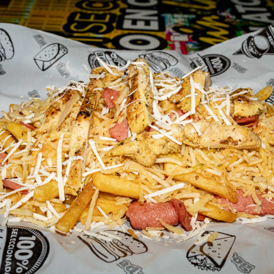 Salchipapa de papas francesa, trozos de pollo, salchicha alemana, chorizo, butifarra, jamón, cebolla crispy, lechuga, queso costeño, salsa de la casa y chongo