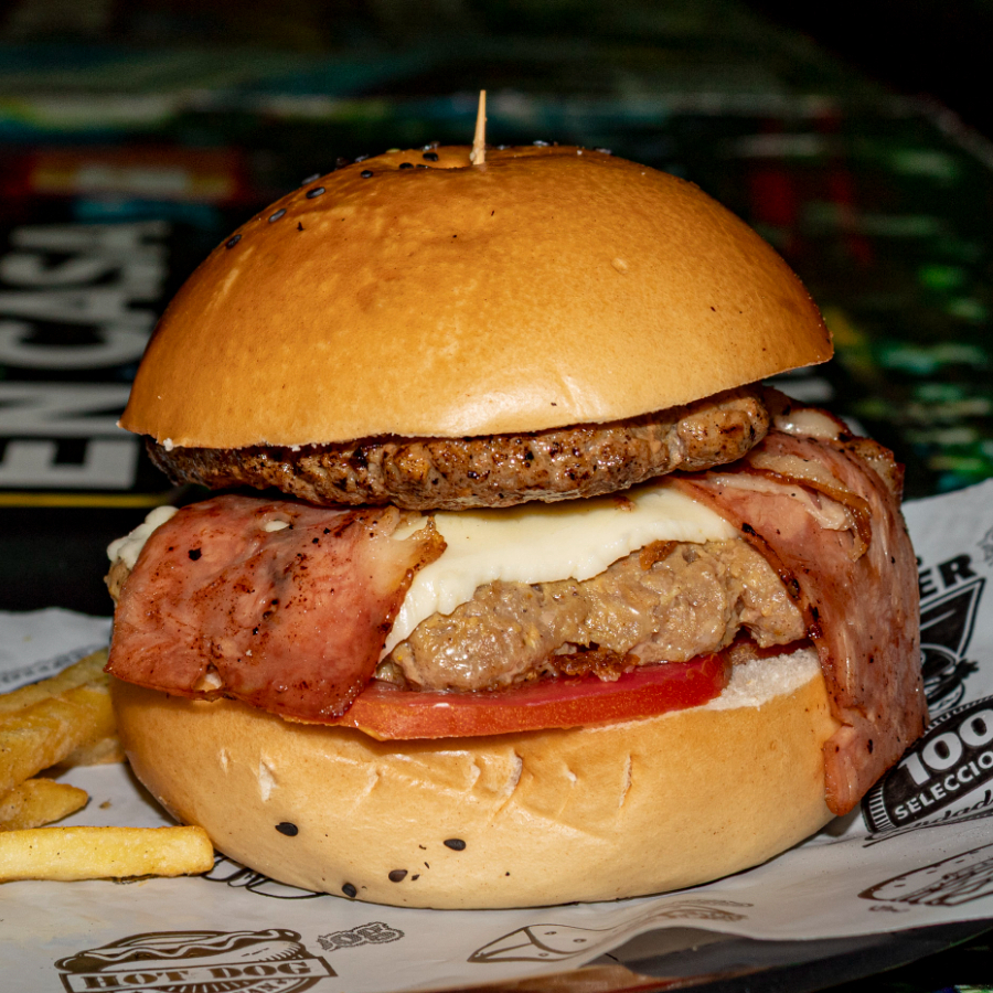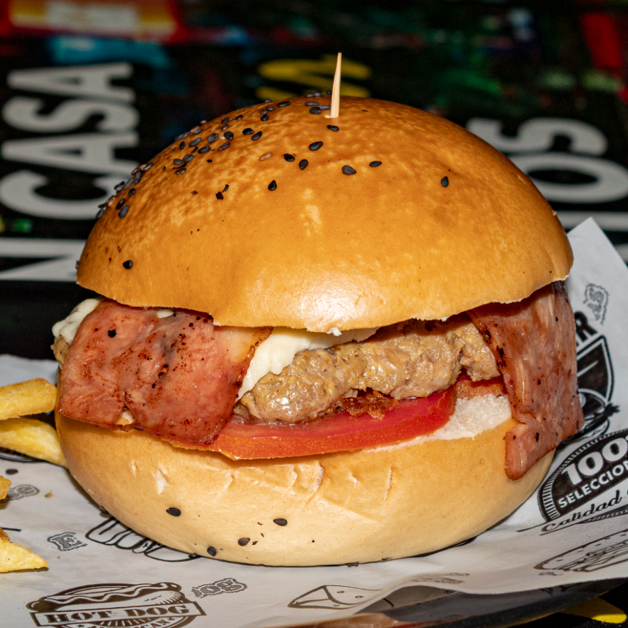Pan finas hierbas, 200 g de carne de la casa, doble tocineta, doble queso americano, lechuga, cebolla y tomate.