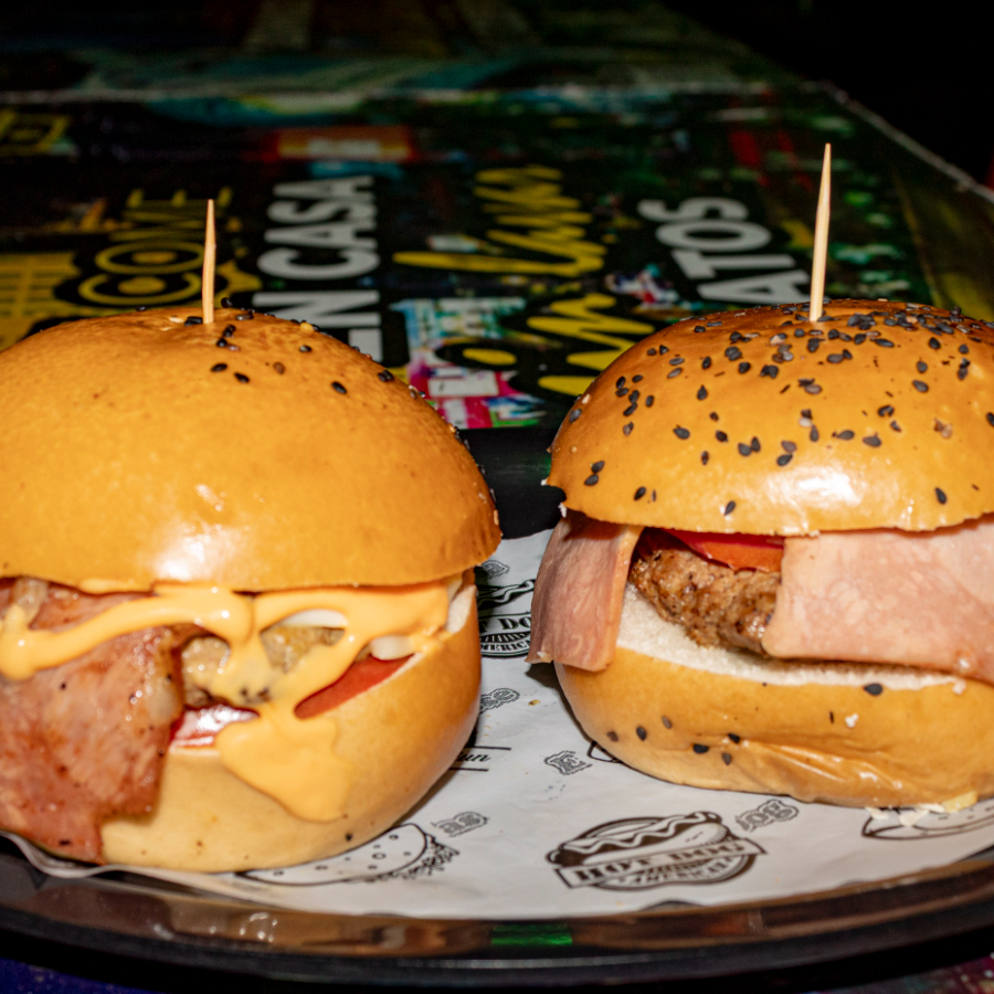 2 Hamburguesas con pan a base de papa, carne de la casa o pechuga de pollo, tocineta, mozzarella, lechuga, cebolla crispy, tomate, salsa de la casa.